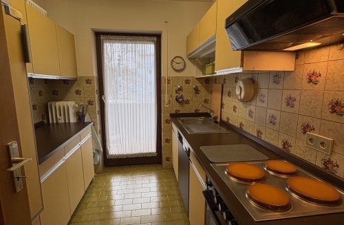 Teilweise Kunststofffenster, Teppichböden, besondere Wohnzimmerdecke, zwei Waschbecken, Badewanne.